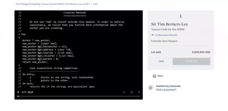Летом прошлого года разработчик Тим Бернерс-Ли на аукционе Sotheby's продал токен с исходным кодом протокола WWW (World Wide Web). Торги начинались с $1 тыс. Итоговая цена лота составила $ 5,4 млн.