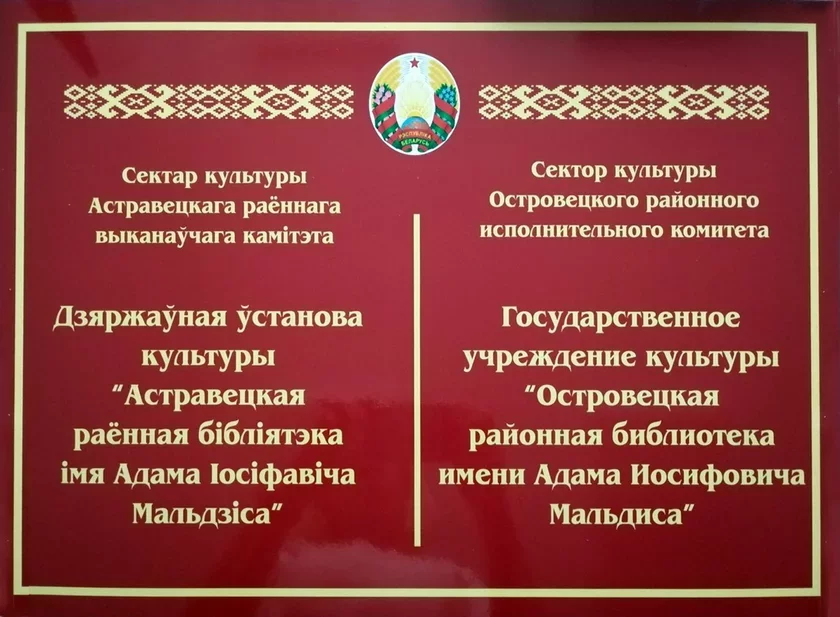 «Обычную вывеску уже сделали. Мемориальную не получится: есть постановление Совета Министров № 1372, по которому подобные доски размещаются на зданиях, где известный человек работал, или жил. Мы в фойе будем делать роспись: открытая книга, на одной странице изображение Адама Мальдиса, на другой полное название библиотеки. Вывеску еще не прикрепили. Планируем это сделать к 7 августа, 90-летию Адама Иосифовича», — процитировал слова директора библиотеки Натальи Очеретовой сын исследователя Ярослав Мальдис.