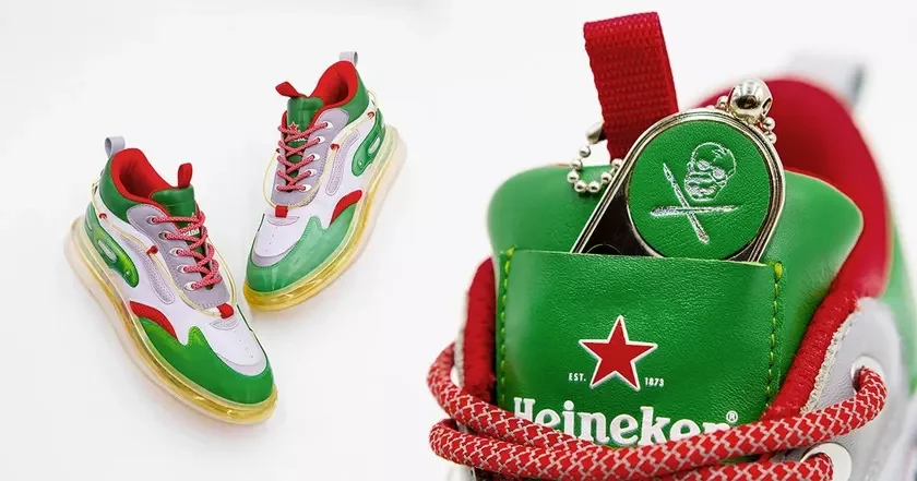Heinekicks имеет несколько уникальных элементов дизайна. Они выполнены в фирменных цветах винокурни, в каждой паре также есть металлическая открывалка для бутылок.
