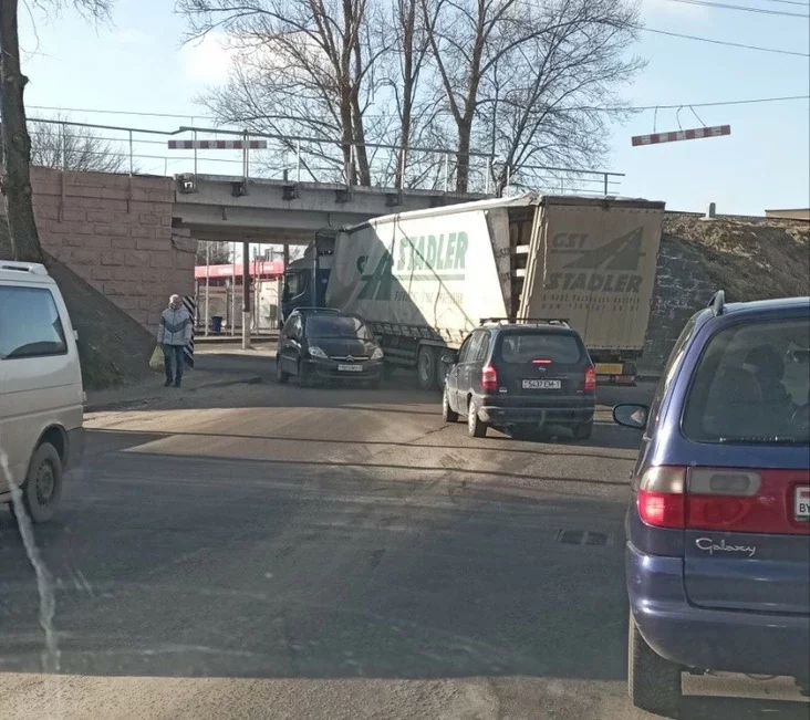 Необычная авария 8 февраля произошла на улице Скрипникова в Бресте. Здесь расположен мост, называемый в народе «Горбатым», а возле него есть дорожный знак, предупреждающий об ограничении высоты. Но водитель одной из фур решил рискнуть, и зря.