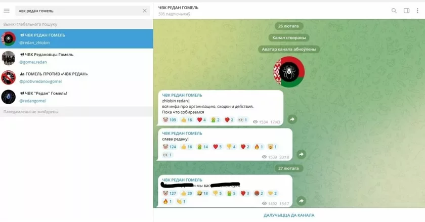 Причем канал ЧВК «Редан Гомель» в телеграме создан 26 февраля под официальным флагом. Одномоментно там набралось более 500 подписчиков. И уже 27 февраля появились угрозы оффникам (оффники — околофутбольные фанаты), под которыми резко появилось более 11 тысяч комментариев.