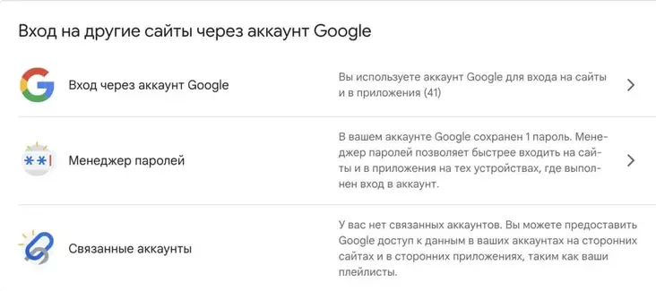 • Чуть ниже, в пункте «Вход через Google», есть список всех сайтов и ресурсов, на которые вы залогинены через Google-аккаунт.