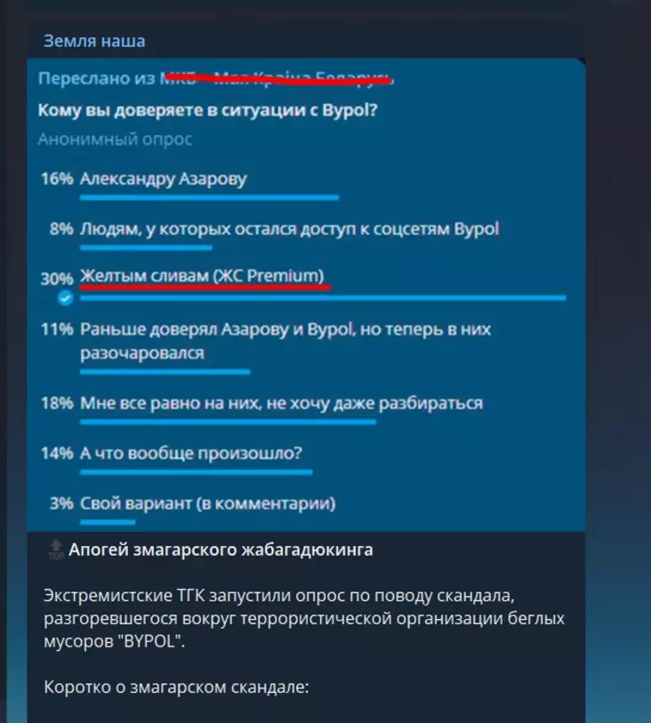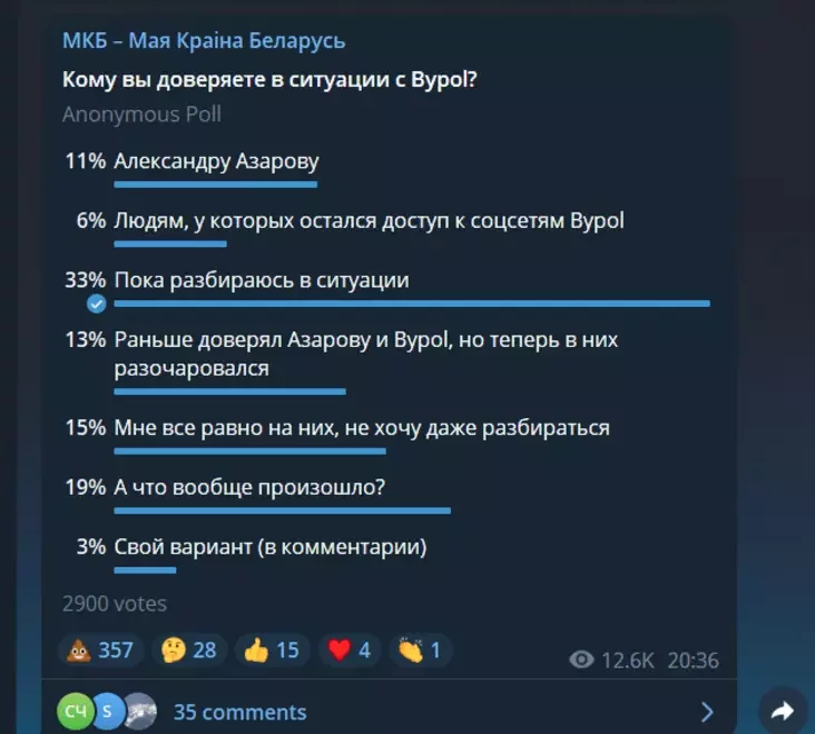 Дело в том, что в самый разгар конфликта в «Байполе», 8 июня, канал «Мая краіна Беларусь» запустил опрос на тему «Кому вы доверяете в ситуации с Bypol?»