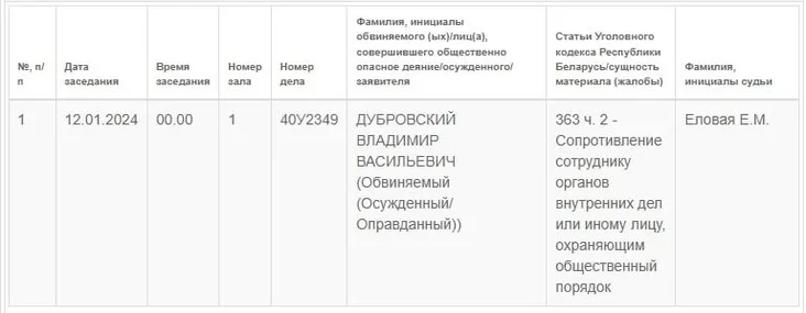 Дальнейшее продолжение его судебного преследования отягощалось депутатским статусом Дубровского, но, как выглядит, в конце концов препятствием это не стало. Сейчас бывшего главного милиционера Новополоцка судят по ст. 363 ч. 2 Уголовного кодекса (сопротивление сотруднику органов внутренних дел или иному лицу, охраняющему общественный порядок).
