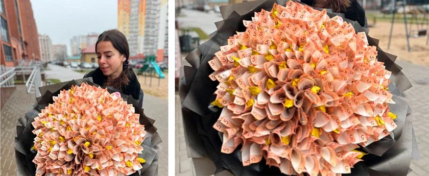 Жительница Бреста Анастасия, которая делает букеты, разместила в своем аккаунте в тиктоке необычный заказ: ее попросили сделать букет из денег. Вместо цветов использованы пятирублевые банкноты и конфеты, пишет Onliner.by.