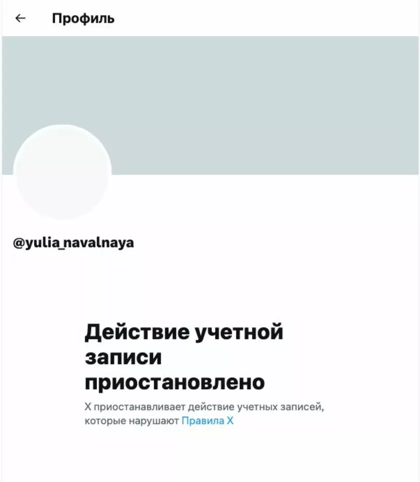 «Действие учетной записи приостановлено. X приостанавливает действие учетных записей, нарушающих правила X», — говорилось на странице Навальной.