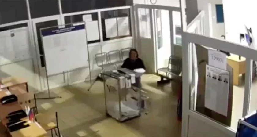 В сети появилось видео, на котором женщина на коленях входит в комнату с урной для бюллетеней и начинает вбрасывать бюллетени, сообщает «Агентство».