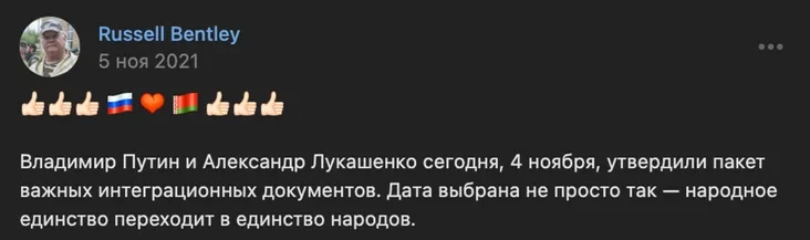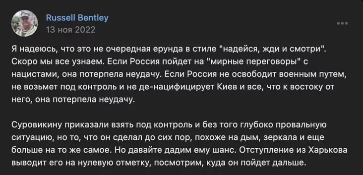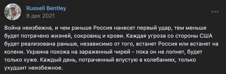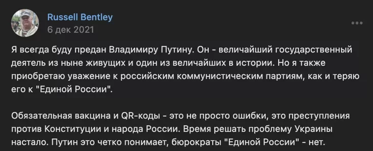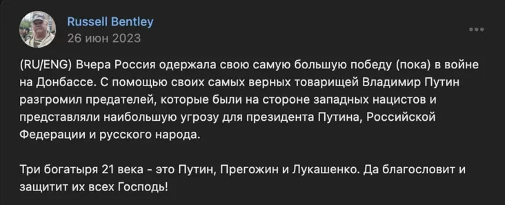 Бентли — «ястреб» войны, который агитирует за то, что с Украиной нельзя вести переговоры, а Киев нужно захватить военным путем. Он агитировал за вторжение в Украину еще до 24 февраля 2024-го. Также Рассел упорно хвалит Путина, Пригожина и Лукашенко.