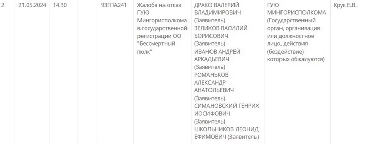 Мингорисполком отказался зарегистрировать общественное объединение «Бессмертный полк», в результате чего его активисты подали жалобу в Минский городской суд. Как следует из расписания на сайте Верховного суда, она будет рассмотрена судьей Еленой Крук 21 мая, заметил Reform.news.