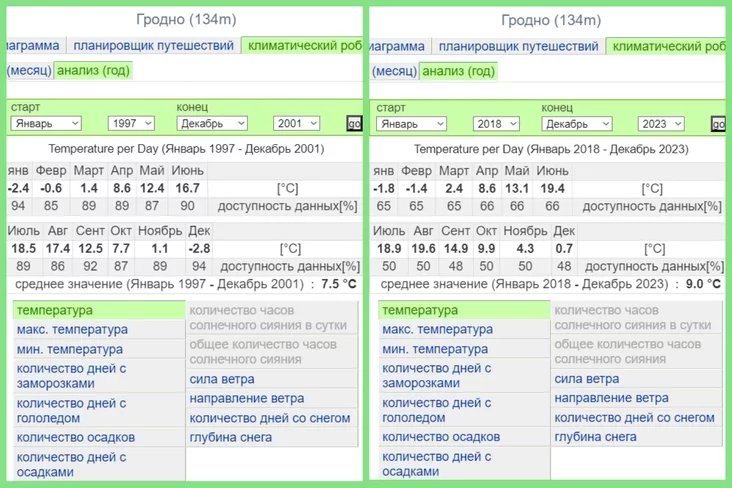На полтора градуса теплее в среднем стало в Гродно. Если в 1997—2001 годах среднегодовая температура составляла 7,5°C, то в период с 2018 по 2023 — равно 9.