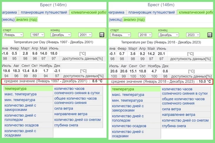 Так, например, только за последние 25 лет средняя годовая температура в Бресте выросла с 8,6 градуса в 1997—2001 годах до 10 градусов в 2018—2023 годах.