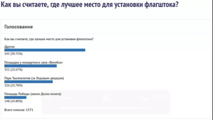 В то же время сохранился запротоколированный скриншот результатов голосования, который свидетельствует, что за парк 1000-летия Витебска в голосовалке было подано всего 23,78% голосов участников — и это лишь третий результат из предложенных вариантов. А 39,75% участников высказались за вариант «иное»: их не устроило ни одно из предложенных мест.