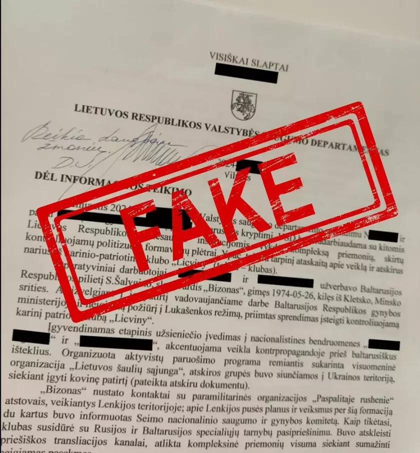 Литовский Департамент государственной безопасности (ДГБ) предупреждает о распространении фейкового документа в Facebook. В документе утверждается, что литовская разведка готовит военизированные группы белорусов, сообщает LRT.