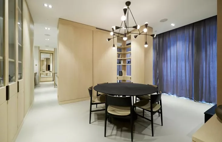 Площадь четырехкомнатной квартиры около 216 квадратов. Просторные светлые комнаты выдержаны в едином стиле — минимализм с акцентом на натуральные материалы и спокойную цветовую гамму.