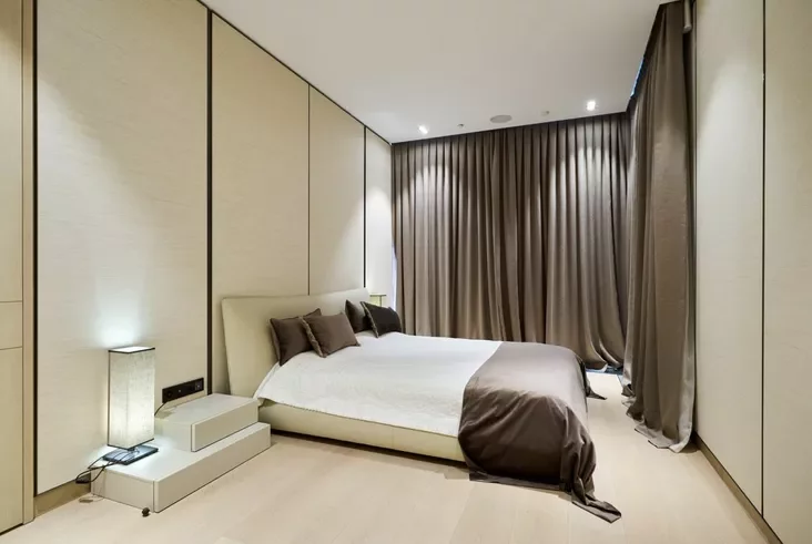 Спальня выдержана в спокойных бежевых и шоколадных цветах.