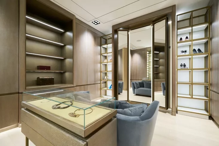 Особого внимания заслуживает гардеробная, которая больше напоминает помещение бутика: витрины, подсветка и продуманная организация хранения.