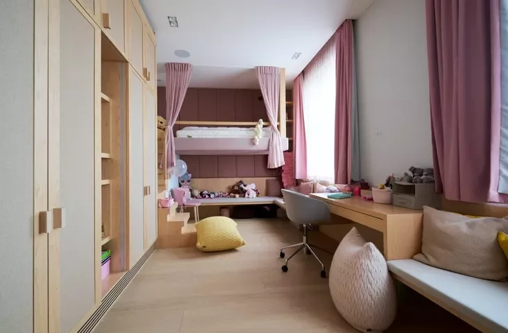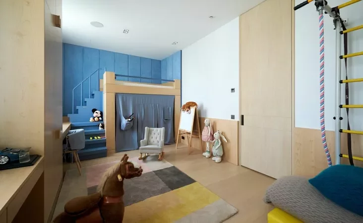 В детских комнатах стоят двухъярусные кровати, интегрированные системы хранения и места для игр.