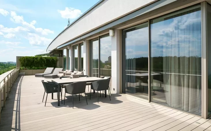 Но главная фишка квартиры — терраса площадью около 93 квадратов. Здесь можно организовать семейный ужин под открытым небом или загорать летом в лаунж-зоне.