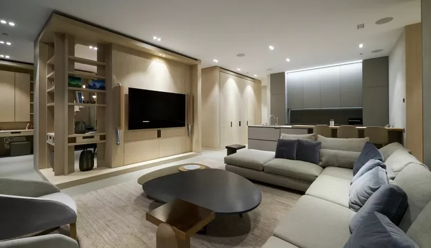 Гостиная с огромным диваном и встроенной медиазоной плавно перетекает в кухню.