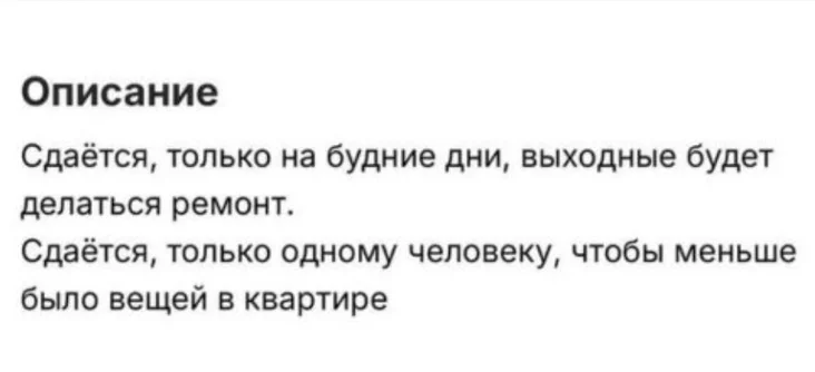 «Сдается только на рабочие дни, в выходные будет делаться ремонт», — говорится в тексте объявления.