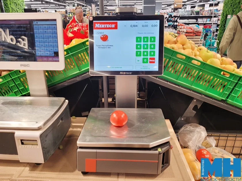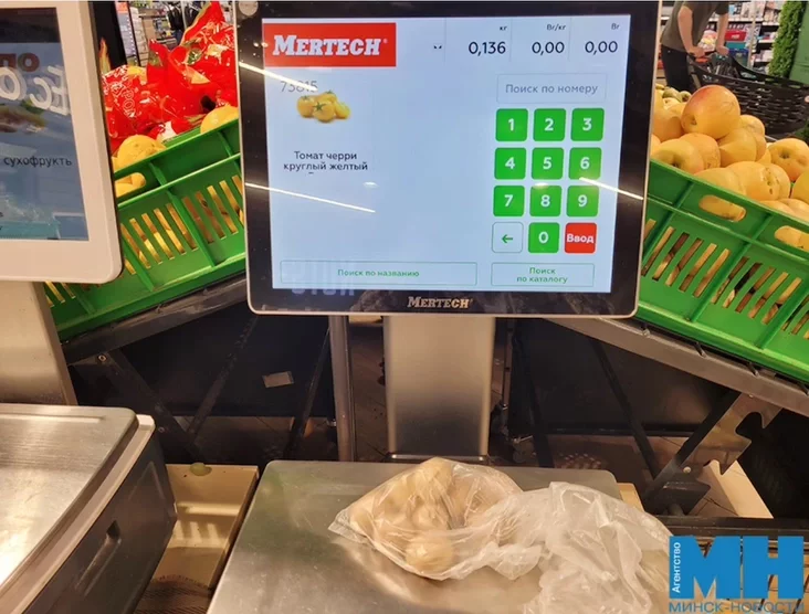 В гипермаркете на проспекте Победителей установили «умные» фасовочные весы, которые автоматически распознают положенные на платформу продукты.