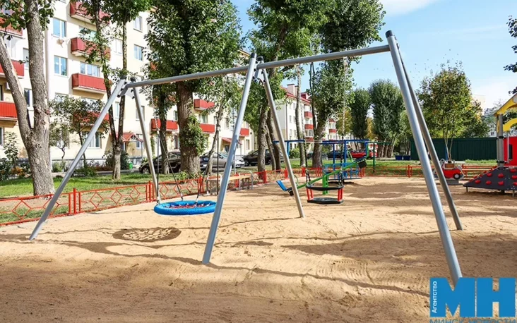 Начали с площадки для маленьких детей. Сюда завезли песок, по периметру установили декоративное ограждение, а внутри — симпатичное оборудование. Игровой комплекс, горки, качалка-балансир, песочница, сдвоенные качели с обычным сиденьем и круглым «гнездом», мини-карусель…