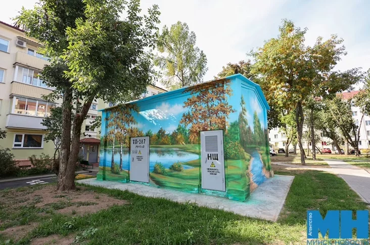 Также стены этого строения украшает белорусский пейзаж — пруд, деревья, облака. К специалистам «Минскэнерго», которые обслуживают этот объект, обратились представители ЖКХ с просьбой придать ему более привлекательный вид.