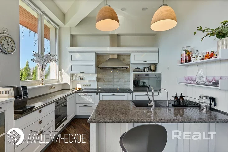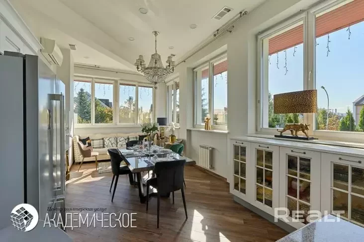 «Комплекс премиум-класса в Дроздах на большом участке в частной собственности. Современное жилье с 2 мастер-спальнями, 5 комнатами, 4 гардеробными, просторной кухней, 4 санузлами и гостиной-столовой-кухней с панорамными окнами. Шале 80 кв. м, с террасой и камином. Бизнес-пространство — с ресепшеном, 8 кабинетами, зоной у бассейна и парковкой на 8 авто», — сообщается в объявлении о продаже.
