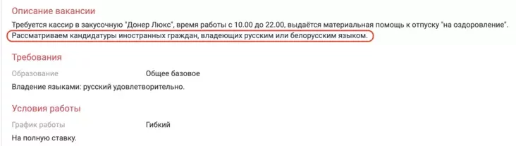 «Вакансия доступна для иностранцев со знанием русского языка», — указано в описании.