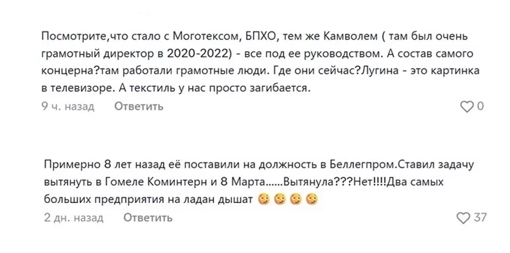 «Посмотрите, что стало с «Моготексом», БПХО (Барановичским производственным хлопчатобумажным объединением — НН), тем же «Камволем» (там был очень грамотный директор в 2020—2022) — все под ее руководством. А состав самого концерна? Там работали грамотные люди. Где они сейчас? Лугина — это картинка в телевизоре. А текстиль у нас просто загибается».