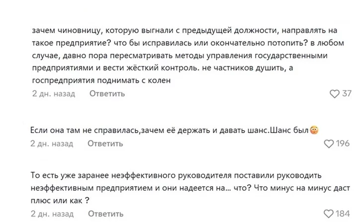 «Зачем чиновницу, которую выгнали с предыдущей должности, направлять на такое предприятие? Чтобы исправилась или окончательно потопить? В любом случае, давно пора пересматривать методы управления государственными предприятиями и вести жесткий контроль. Не частников душить, а госпредприятия поднимать с колен».