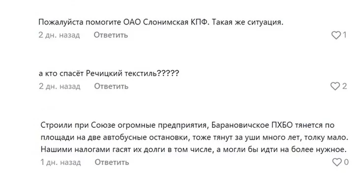 «Строили при Союзе огромные предприятия, Барановичское ПХБО тянется по площади на две автобусные остановки, тоже тянут за уши много лет, толку мало. Нашими налогами гасят их долги в том числе, а могли бы идти на более нужное».