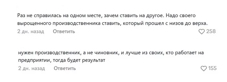 «Раз не справилась на одном месте, зачем ставить на другое. Надо своего выращенного производственника ставить, который прошел с низов до верха».