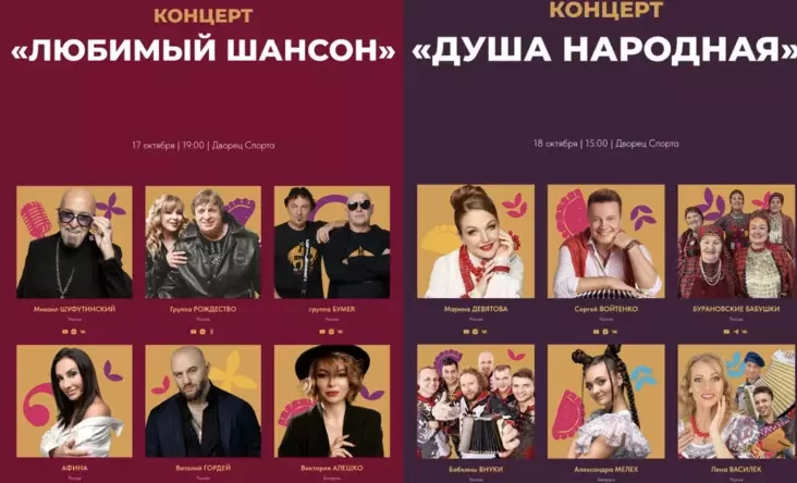 На вечер 18 октября запланированы выступления «Бурановских бабушек». В концерте среди прочих будет участвовать Александра Мелех — это она спела песню «Ах, Александр» в честь Лукашенко.