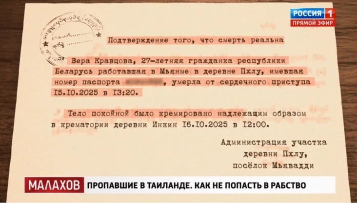 Родителям погибшей Веры прислали из Мьянмы странную справку о ее кремации