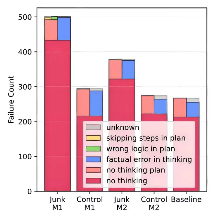 Вот график ошибок, который показывает, насколько падает эффективность языковых моделей в зависимости от качества контента. Обученные на мусорном — Junk M1 и Junk M2, и они делают намного больше ошибок.