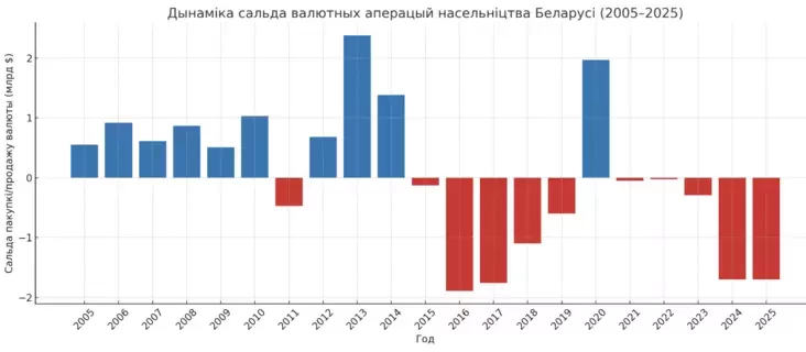 График «Нашай Нівы», показывающий сальдо валютных операций населения за последние 20 лет. Данные за 2025 год прогнозные, они выстраиваются на основе данных за девять месяцев года.