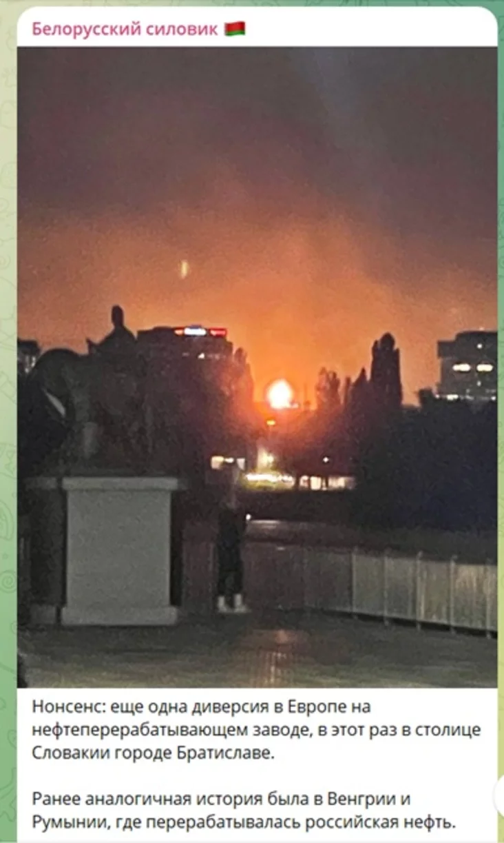 «Нонсенс: ещё одна диверсия в Европе на нефтеперерабатывающем заводе, на этот раз в столице Словакии городе Братиславе», — написали редакторы канала и сопроводили информацию снимком.