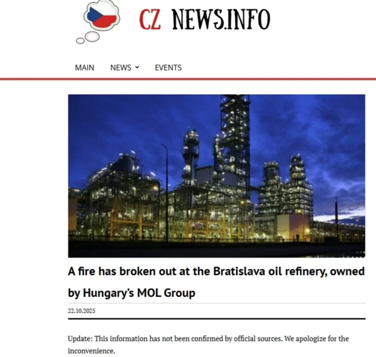 Вечером 22 октября российские и лукашенковские СМИ опубликовали информацию о пожаре на НПЗ в Словакии. Для чего?