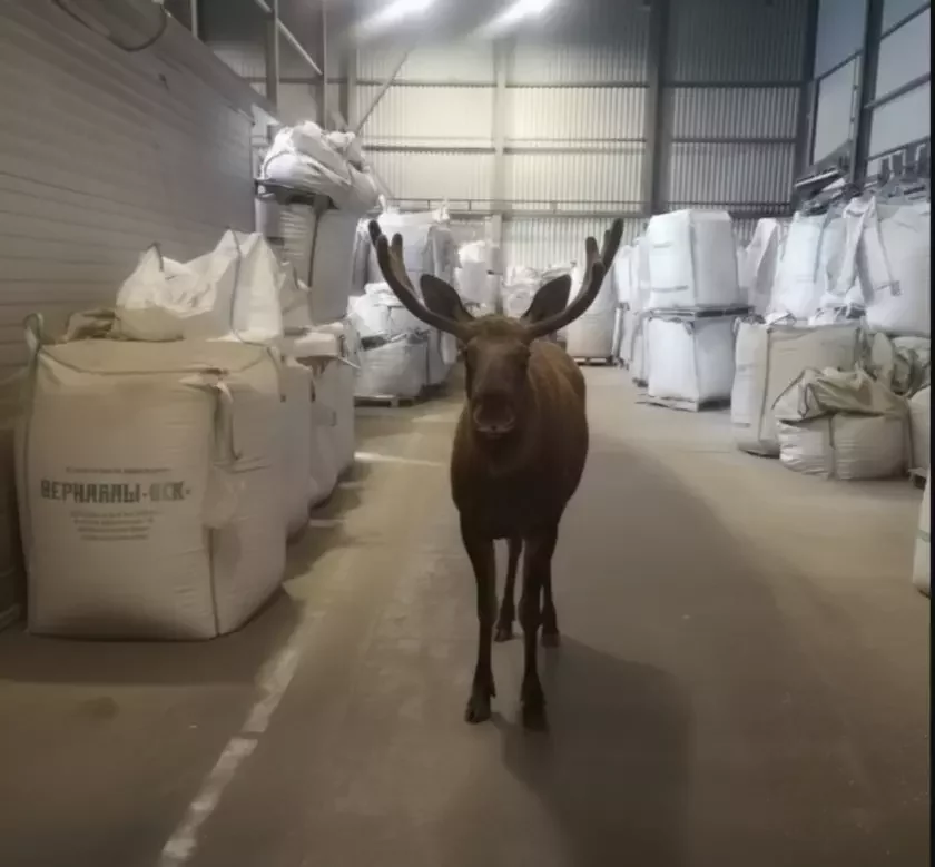 Во время ночной смены в цех, ворота которого были открыты со стороны леса, зашел взрослый лось с огромными рогами.