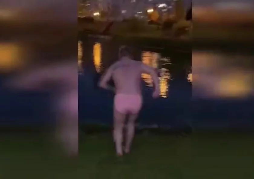 Парень в трусах бегал по городу, а затем прыгнул в воду.