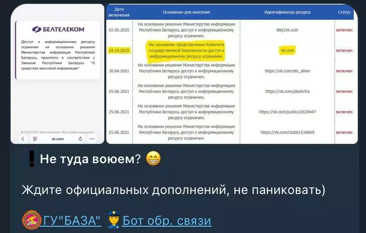 Сайт «ВКонтакте» решением КГБ был внесен в список ресурсов для ограниченного доступа, у некоторых операторов он уже перестал открываться. На новость сразу отреагировали близкие к силовикам и провластные каналы.
