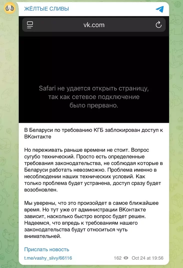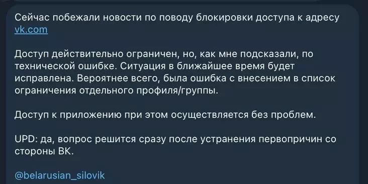 Позже «Белорусский силовик» дополнил: desktop-версия соцсети не работает, так как компания не выполнила требования государственных органов. «ВК не захотел учитывать интересы Беларуси и попал в блок».
