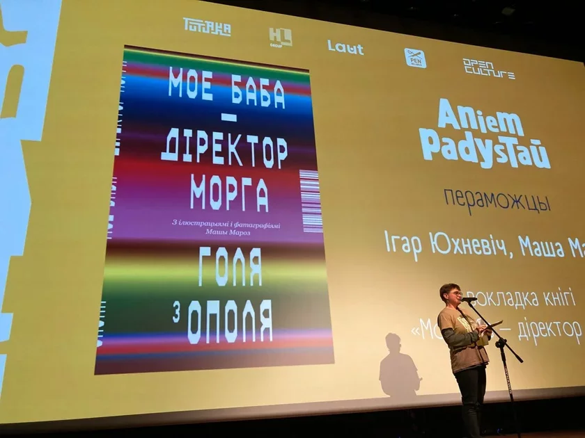 Победителями стали Игорь Юхневич и Маша Мороз за оформление книги «Мое баба — діректор морга» автора Голі з Ополя (самиздат, 2024).