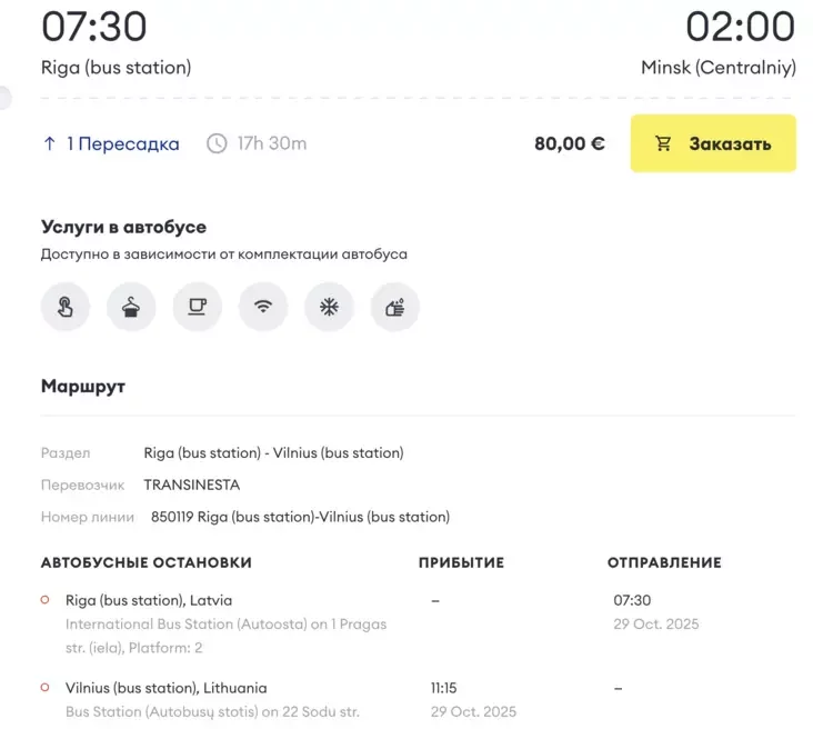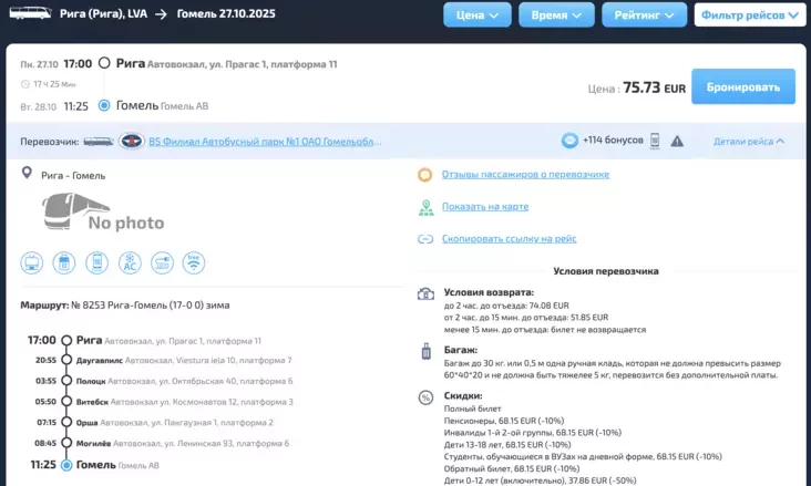 Среди рейсов, которые еще едут через белорусско-латвийскую границу — Рига — Гомель. Едет он через Даугавпилс (Двинск), Полоцк, Витебск, Оршу и Могилев.