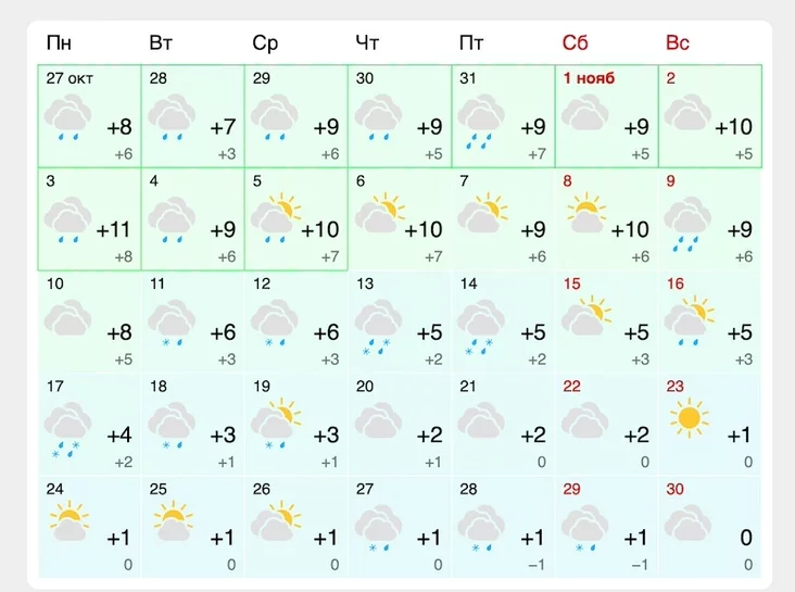 В четверг, 30 октября, ночью 0.. +6°С, максимальная температура днем составит от +8°С по северо-востоку до +15°С по югу.