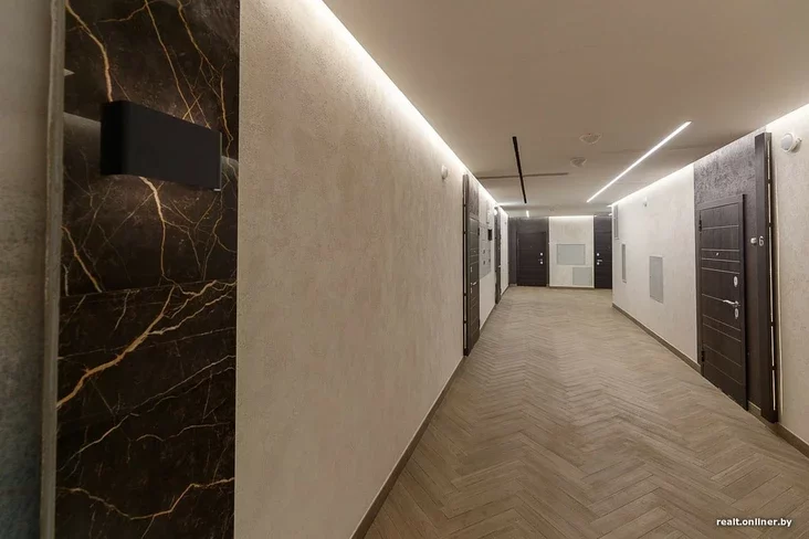 Отделку мест общего пользования постарались сделать под стать премиальному званию. Холл на первом этаже отделан керамической плиткой под мрамор, имеется интересная подсветка потолка и декоративные панели с подсветкой номеров квартир.