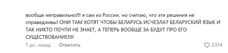 Интересно, что даже люди из России считают, что это неправильное решение, которое грозит исчезновением белорусского языка и национальной идентичности. Они поддерживают обеспокоенность белорусов.
