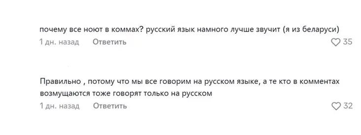 «Почему все ноют в коммах? Русский язык намного лучше звучит (я из Беларуси)», «Правильно, потому что мы все говорим на русском языке, а те, кто в комментах возмущаются, тоже говорят только на русском».