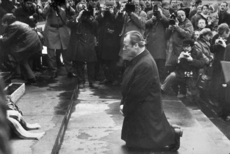 7 декабря 1970 года во время своего визита в Польшу Вилли Брандт сделал неожиданный жест. Дипломатическим протоколом было предусмотрено возложение венка к памятнику героям Варшавского гетто. Выполнив обязательную часть церемонии, Вилли Брандт опустился на колени прямо на мокрую холодную плитку перед монументом. На родине его поступок оценили не все. Половина западных немцев сочла его излишним и нелепым.